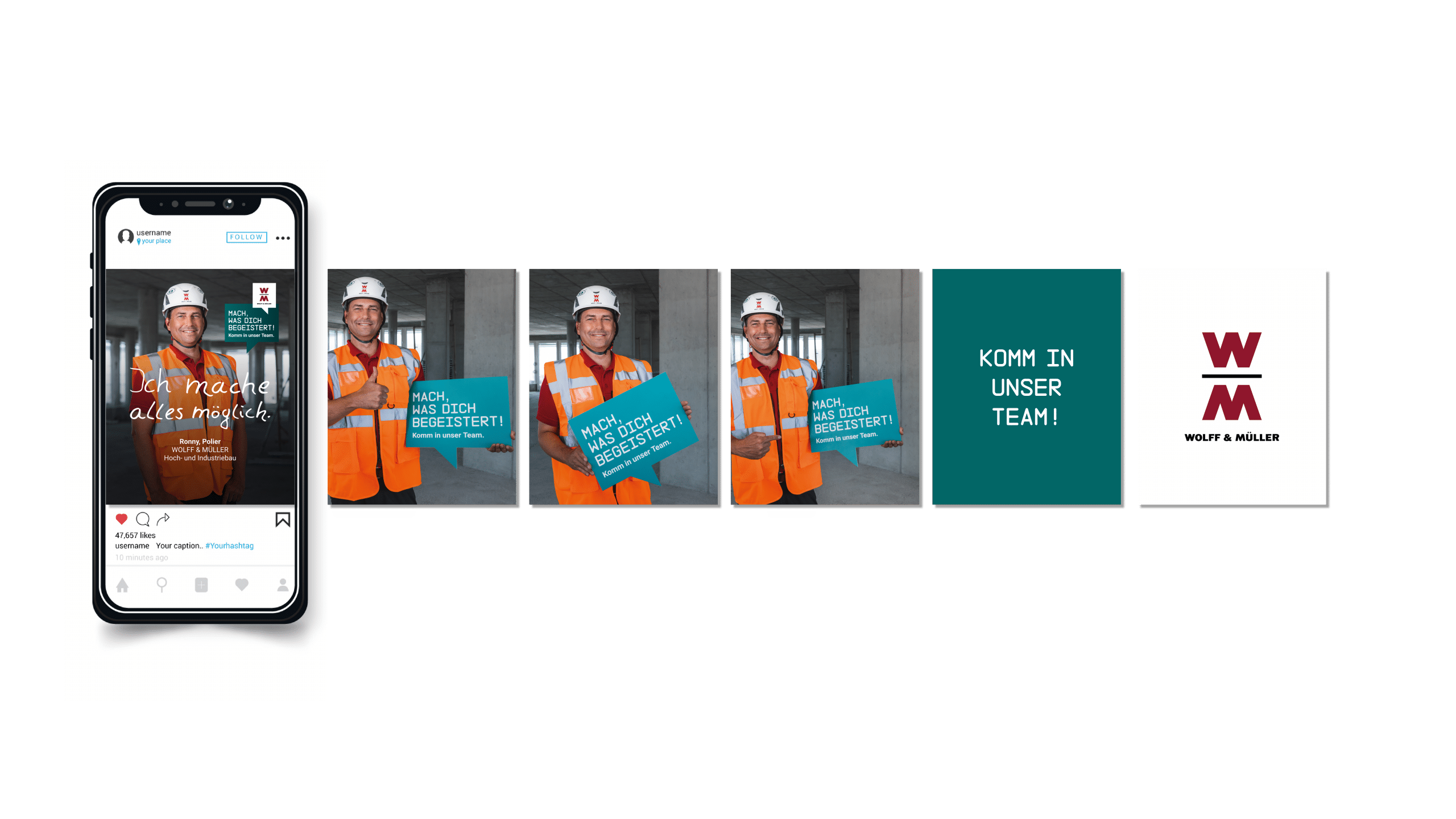 „Mach, was dich begeistert“ – ein Recruiting-Versprechen, das direkt aus den Markenwerten von WOLFF & MÜLLER kommt („Bauen mit Begeisterung“). Das Versprechen wurde inhaltlich unterfüttert mit Statements und Zitaten der Unternehmensmitarbeiter. Das Ganze hat auch WOLFF & MÜLLER begeistert: In 2023 gab es im Schnitt jeden Tag eine neue Einstellung.