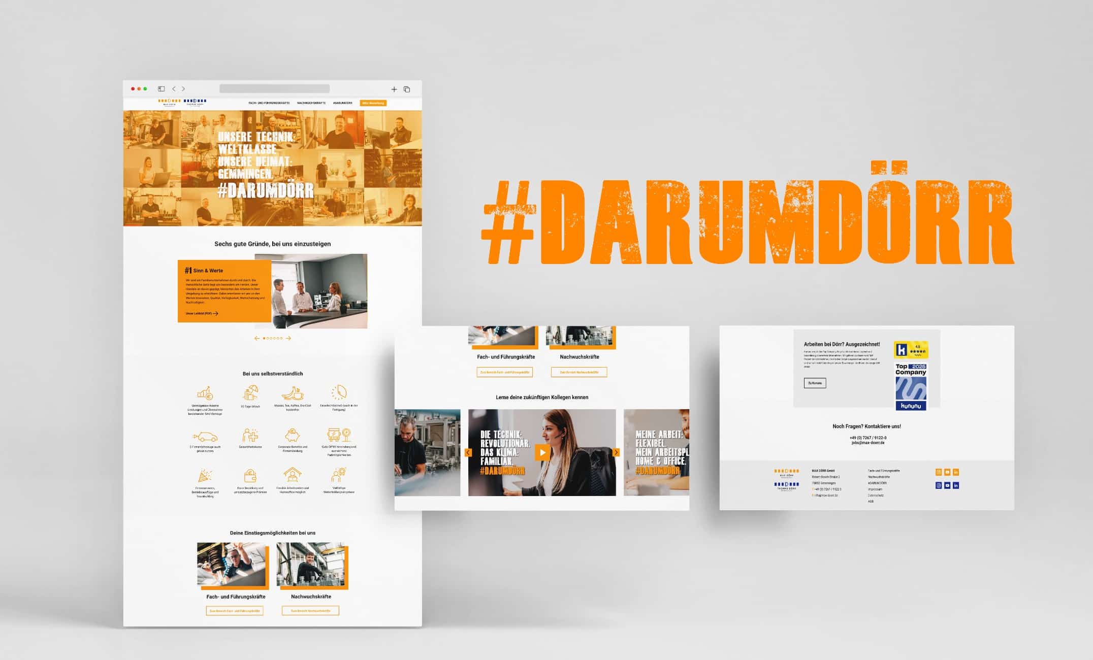 Neben den ausgeschriebenen Stellen soll die Website die beiden Firmen kurz vorstellen und einen Eindruck in das Arbeitsleben bei DÖRR geben. Hier stehen die Unternehmenswerte, die Benefits sowie persönliche Stimmen bestehender Mitarbeiter im Fokus. Die visuelle Umsetzung orientiert sich an der Arbeitgebermarke #DARUMDÖRR.